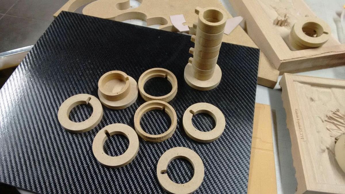 Para fabricar los cilindros, resultaba bastante complicado mecanizarlos de un redondo de madera, así que la mejor opción que se nos ocurrió fue mecanizar discos en tablero de 16 y 10mm para irlos empalmando y encolándolos obteniendo así el disco con las aberturas y pestañas necesarias. Paso a comentaros las diferentes piezas de las que se compone un criptex: