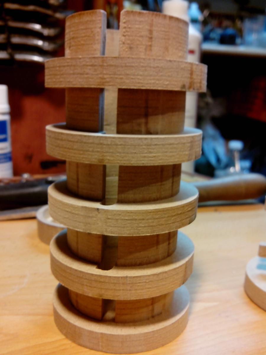 Hay que tener en cuenta una cosa bastante importante antes de pegar las piezas. El cilindro interior, no hay problema, se puede pegar directamente. Pero el exterior, hay que pegarlo con los discos giratorios en su sitio, pero dejando que giren libremente. Por supuesto, si se quiere pintar, tambien hay que hacerlo antes.