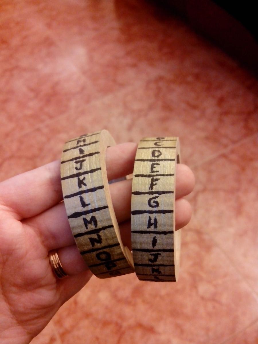 Anillos: Habrán 5 anillos, uno por carácter, que estarán dentro del cilindro exterior. Estos anillos pueden girar y tienes tambien una abertura interior. Si se alinean con las ranuras del cilindro exterior, el criptex se podrá abrir.