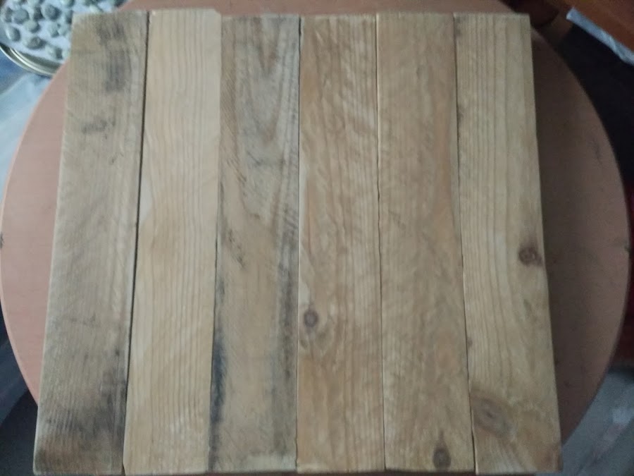 Tomamos medidas para conseguir al menos 6 maderas iguales y otras 2 más que pegaremos por detrás de las otras 6 maderas para sujetarlas. No os doy medidas por que no todos los palets son iguales.