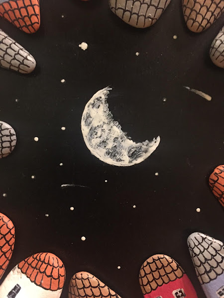 Y con pintura luminiscente (se ilumina en la oscuridad) le pinté las estrellas y la luna, además de alguna ventana de las casitas. Un detalle que me pareció original.