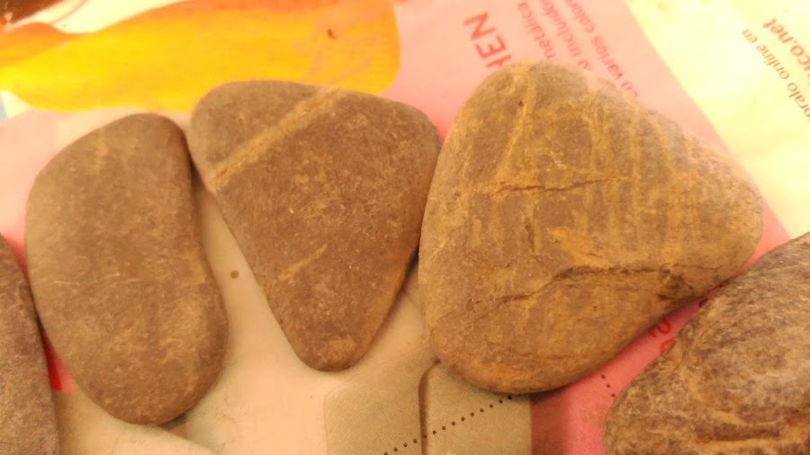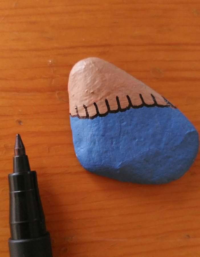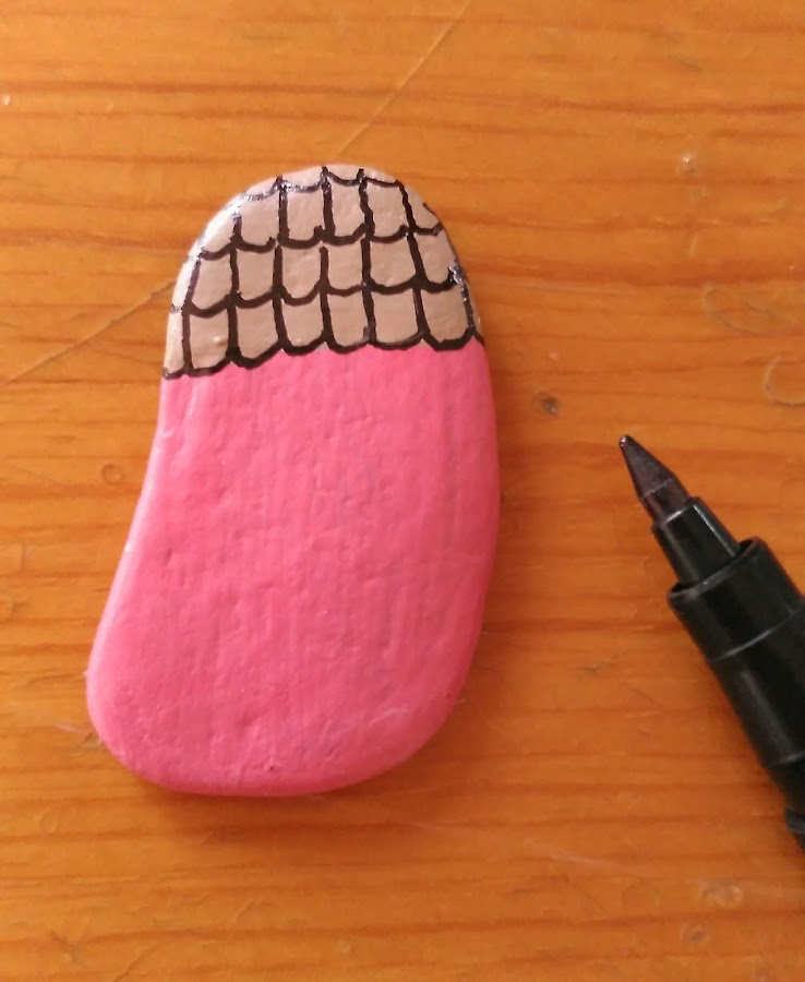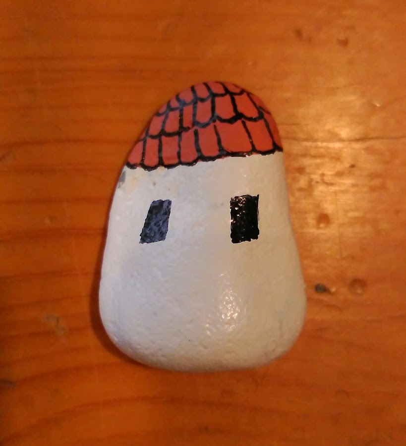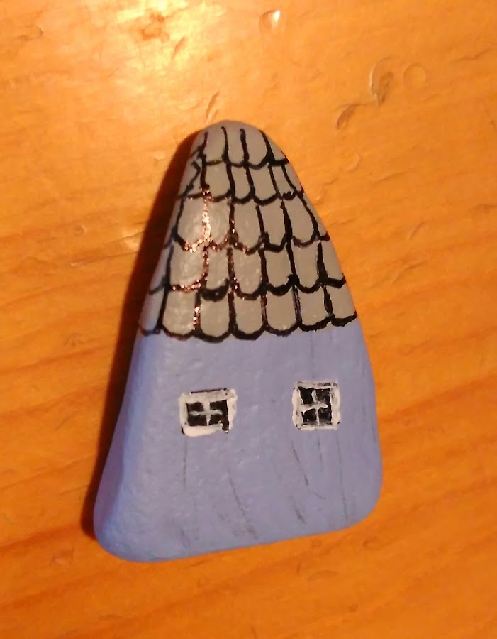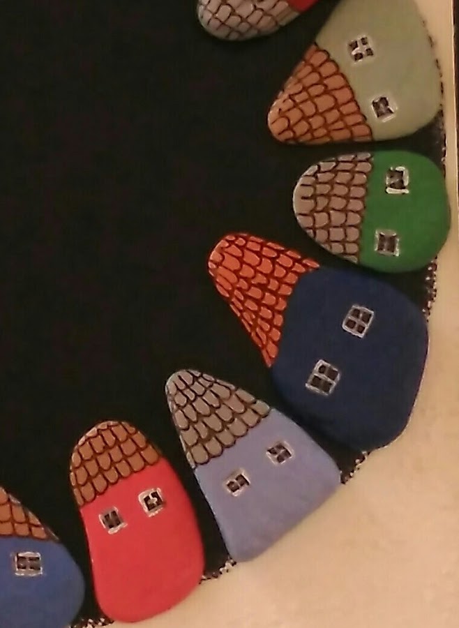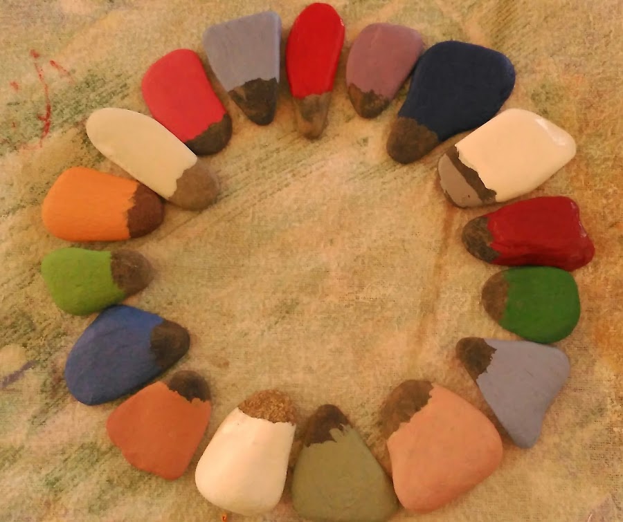 Ahora tocaba trabajar las piedras. Irían colocadas sobre el círculo, y para ello primero las pinté y decoré a modo de casitas de diferentes colores.
