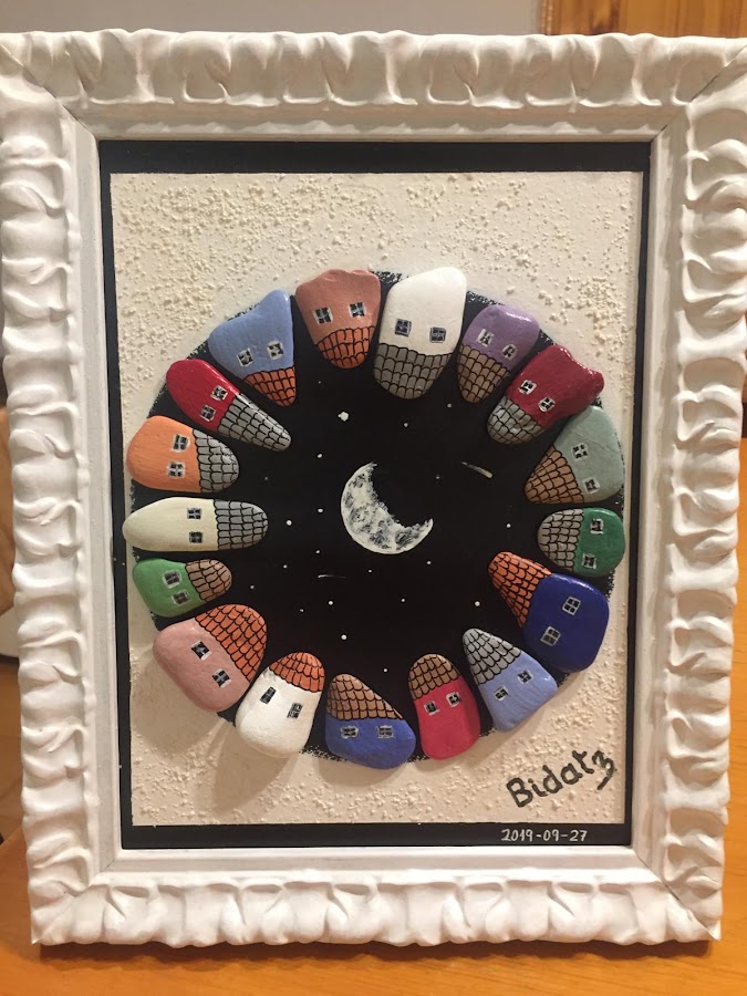 Se trata de un cuadro decorativo realizado con piedras de río como base.