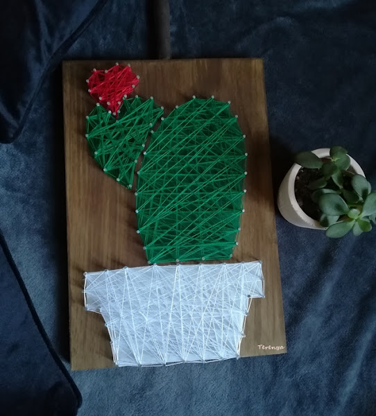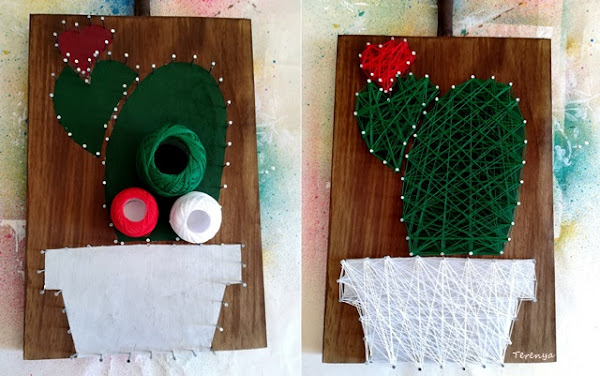 El material es sencillo, una tabla de madera, una plantilla de stencil casera con forma de cactus, pintura acrílica, clavos e hilos.