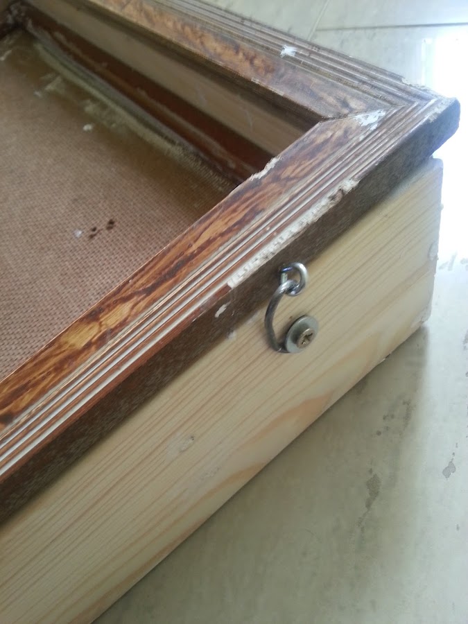 Como es un expositor por un lado van las bisagras que unen nuestro viejo marco a la caja del expositor, y por el otro lado con alambre, tornillo y una hembrilla hago unos ganchos.