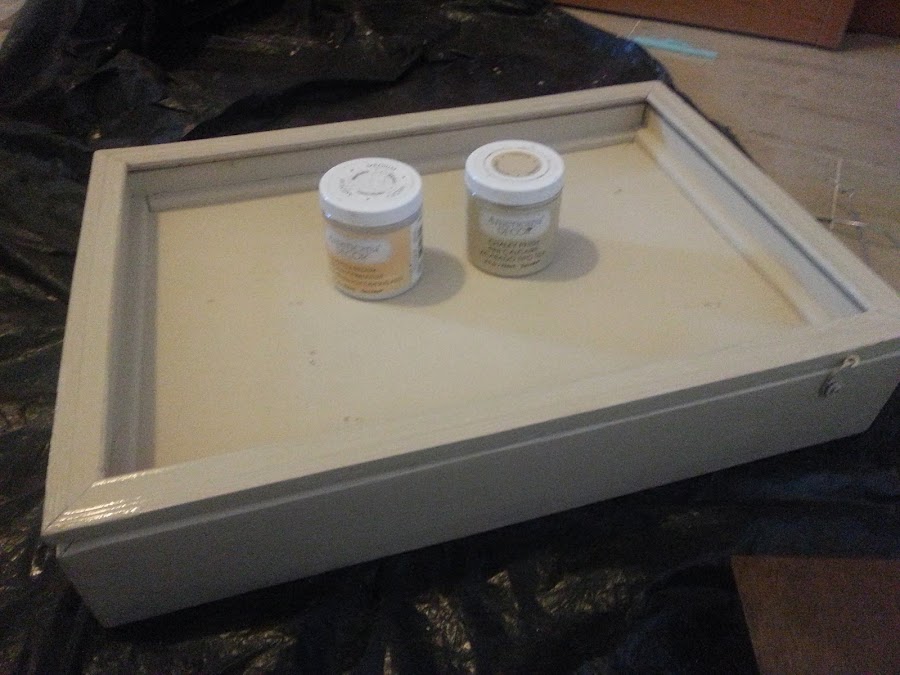 Con las pinturas que se ven en la foto, son pinturas a la tiza de la marca a la americana, doy una mano, de blanco roto y seguido le doy dos manos de craquelador, dejando secar por completo las manos de craquelador.
