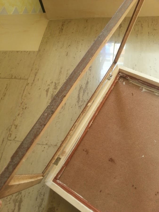 La tabla de dm que se ve, esta apoyada sobre las esquinas que pegué de las cajas de las fruta, pego por todo el perímetro un junquillo como se puede ver en esta foto. Quedando unido tanto a la caja como a la tabla de dm.