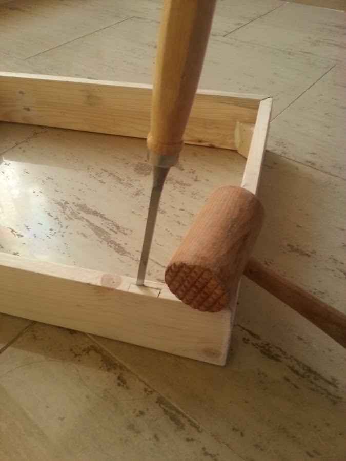 En esta foto os cuento como con el escoplo golpeando con un martillo de madera hago un cajeado para insertar las bisagras.
