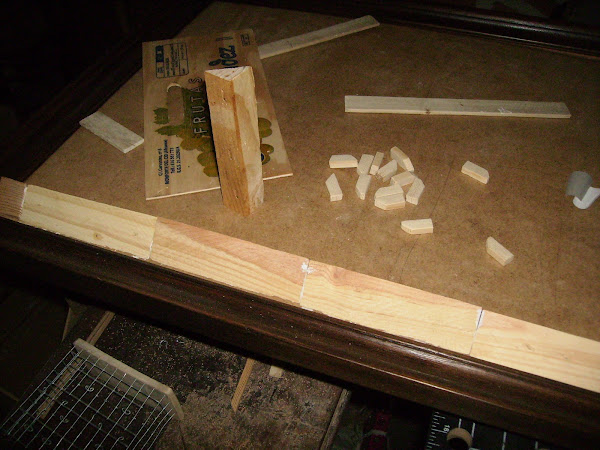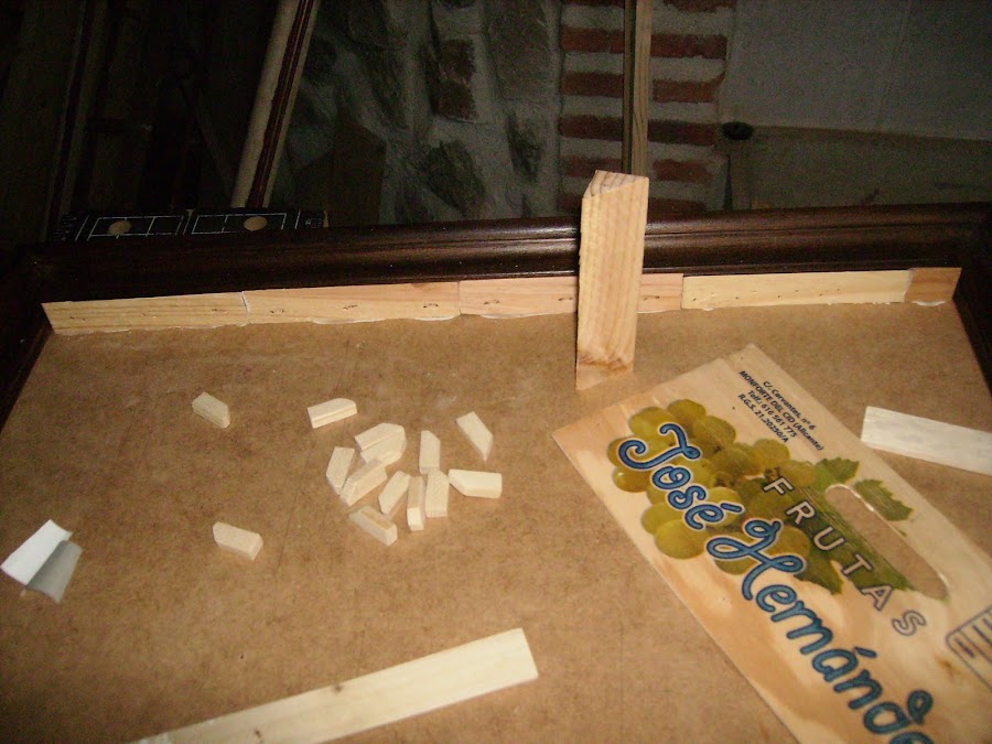 Con un listón finito de madera voy cortando uno a uno lo que serán los canecillos del tejado de la fachada.