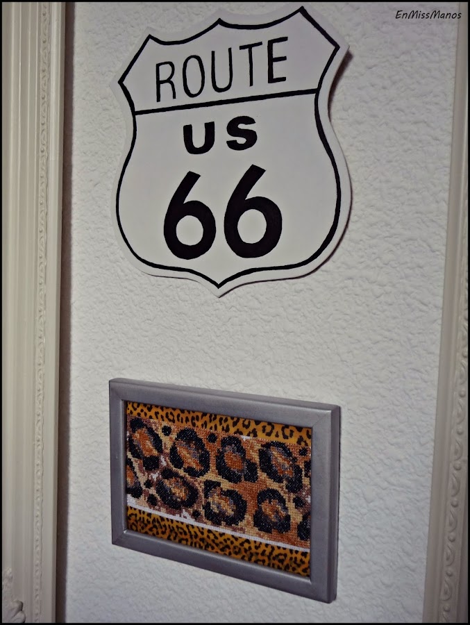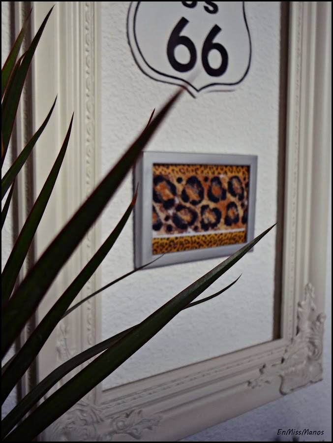 Pues ya con unas fotos y el cartel que pinté de ruta 66 lo tenía casi completo, pero me quedaba un hueco muy vacío abajo, y ahí que fue a parar el nuevo cuadrito de leopardo.