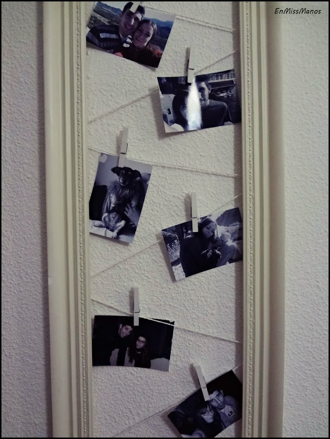 Las fotos las colgué en zig-zag con hilo y pinzas pintadas de blanco