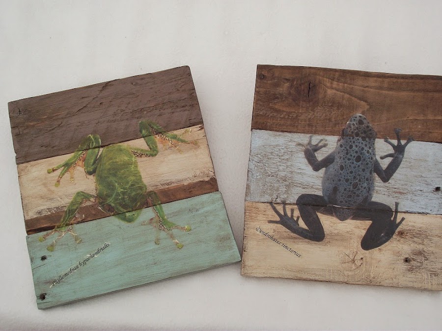 Tres de los cuadros así formados los decoré con un decoupage de ranas de la colección de Global Herp, impresas en papel de arroz. También imprimí los nombres científicos tanto de los animales como de las plantas.