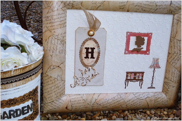 Con la big Shot se ha cortado en cartulina blanca el arabesco que luego Helena ha estampado con un sello , tinta Stazon marrón y sombreado con tinta oscura.