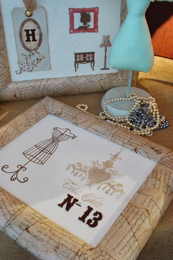El marco esta cortado en papel scrap y la silueta de la mujer en un vinilo grueso.