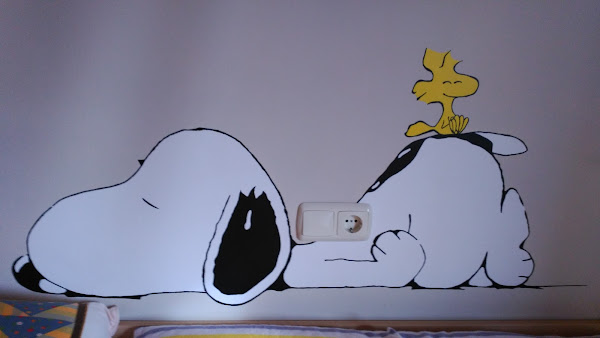 Snoopy gigante dibujado y pintado a mano sobre la cama de mi hijo