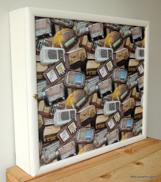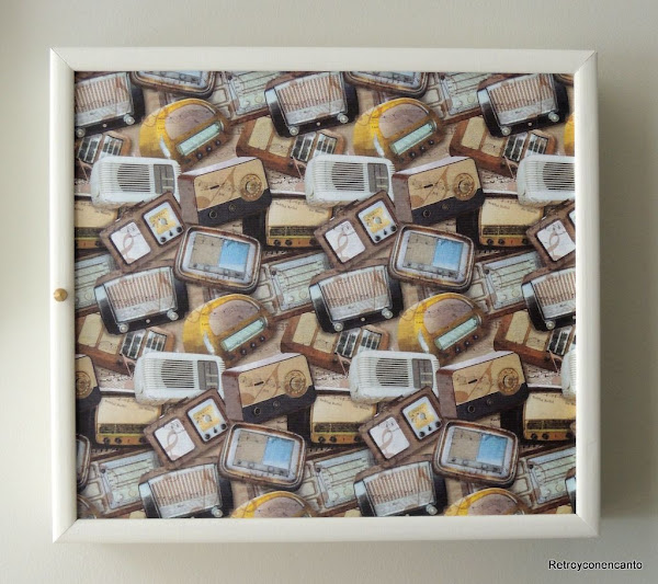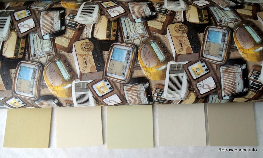 El siguiente paso es ponerse de acuerdo en la decoración. Este bonito estampado de radios antiguas fue el papel que escogió Carmen, y el color, el segundo por la izquierda. ¡Qué buena cosa fue hacer nuestro muestrario de pinturas, pues nos facilita mucho el trabajo!