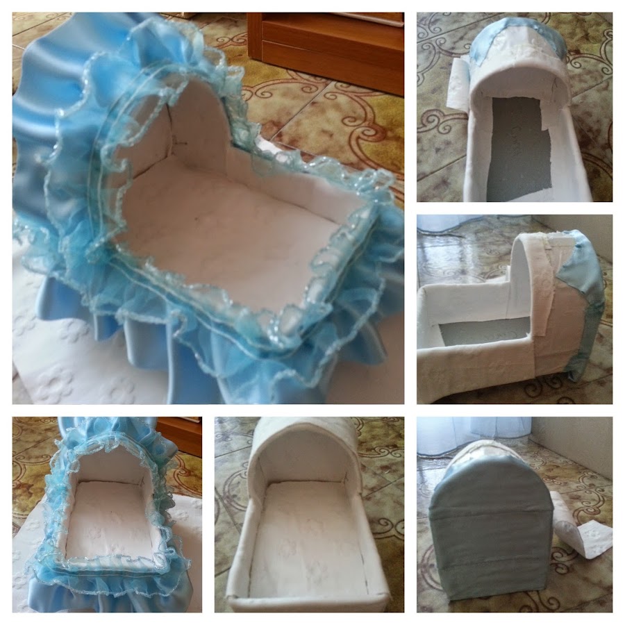 el cuarto y ultimo paso es para definir los últimos detalles de la cunitas que pondremos sobre la torta, use los mismo accesorios de la canasta que pueden ver pinchando aquí Canasta y al final ponemos nuestro munecos en miniaturas que compramos para meter adentro y asi hacer de bebe.