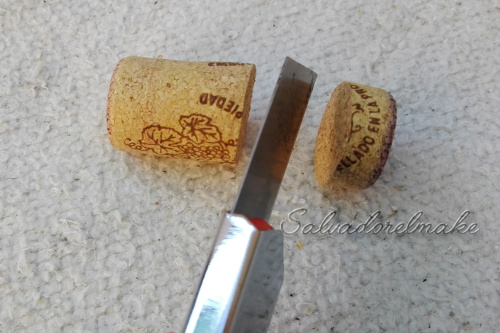 Con un poco de maña y un cúter de precisión bien afilado se pueden reciclar tapones de corcho para decorar un llavero/pastillero.