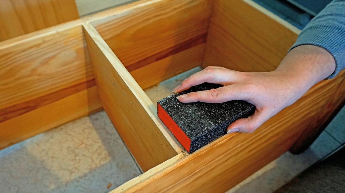 Por detrás tiene una madera fina grapada y pegada en algunos puntos. Para quitarla, haz palanca con destornilladores de cabeza plana de diferentes tamaños. Y quita las grapas con un alicate. Luego lija todo bien.