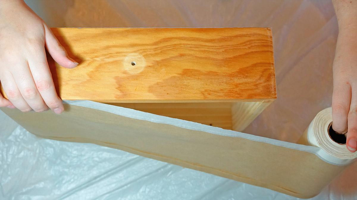 Primero lija la zona y retira el polvo con un paño. Protege la zona que quieras pintar con el papel con cinta. Pinta con el spray. Cuando esté seco aplica barniz o cera.