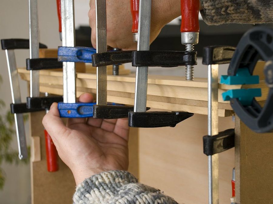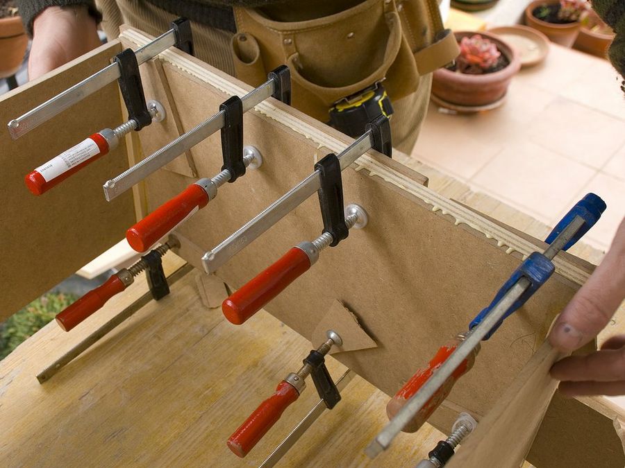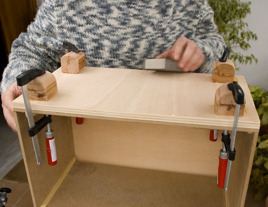 Para darle más solidez y empaque al mueble, recrecemos la base con tablero contrachapado de 19 mm. Marcamos el perímetro, aprovechando el ángulo recto que viene cortado del almacén. Ponemos cola de carpintero, la extendemos bien con el rodillo, y afianzamos la unión con una generosa batería de mordazas.