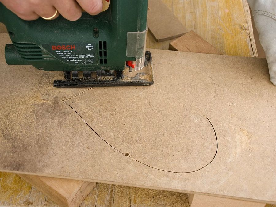 Abordamos el diseño de las puertas del armarito. Con una media plantilla dibujamos sendos corazones y los recortamos con la sierra caladora, herramienta idónea para trazos curvos. A la vez que adornan, los corazones darán ligereza a las puertas.