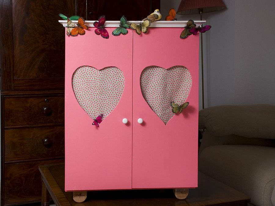El mueblecito terminado. Es una tarea muy satisfactoria, a la que una mano femenina ha puesto el toque decorativo final con mariposas y flores, buscando causar una impresión inolvidable a la futura propietaria. ¡Veamos paso a paso todo el montaje!
