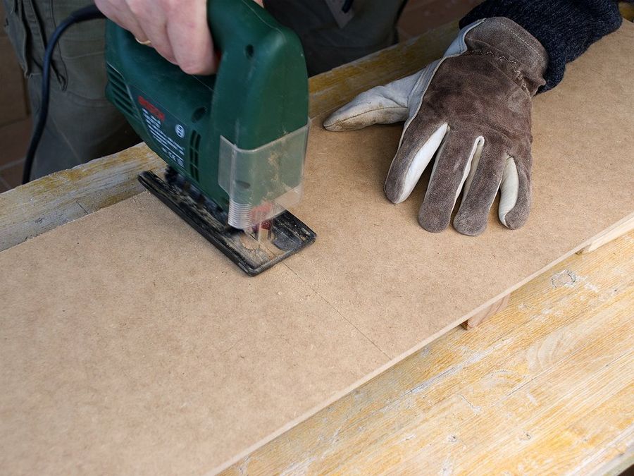 Comenzamos la tarea cortando las piezas para los laterales del armario. Hemos escogido para realizarlo el tablero DM de 7 mm de grosor, que cortamos con la sierra caladora.