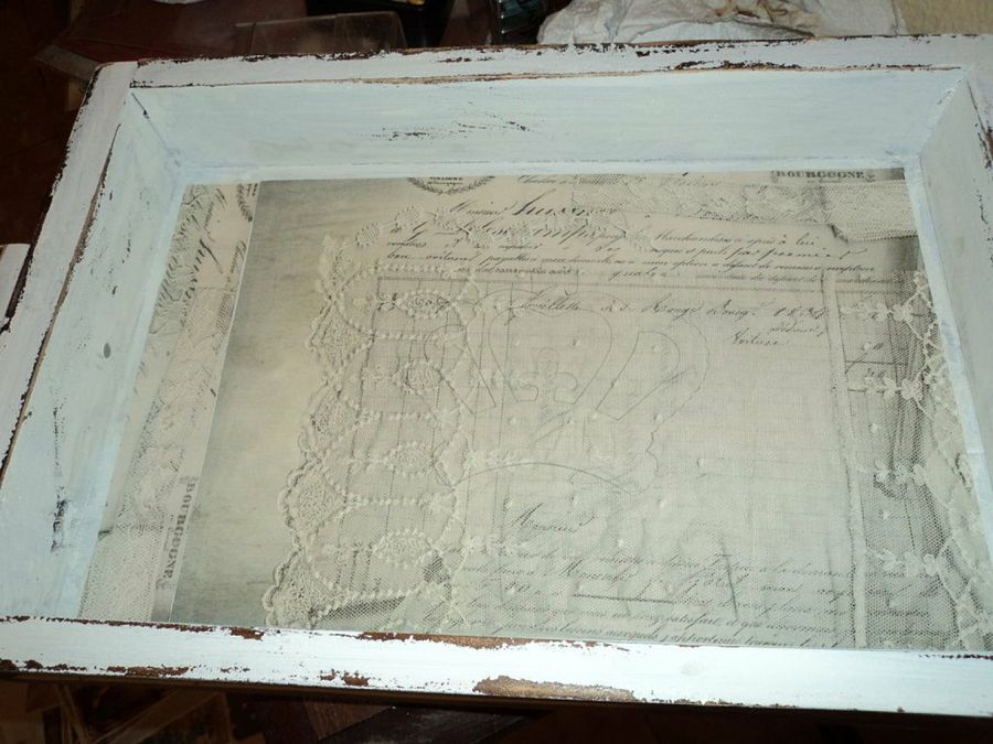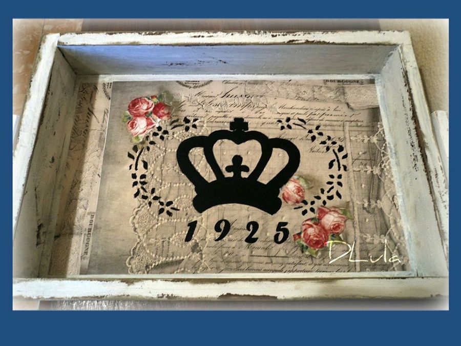 Nuestra amiga DLula es una gran aficionada al reciclaje, y continuamente guarda toda clase de chismes para darles inspirado uso en cualquier momento. Así lo ha hecho con los cajones de un viejo escritorio desaparecido; con dos de ellos hizo pequeños baúles, y el tercero, de menos fondo, lo ha convertido en una preciosa bandeja vintage.