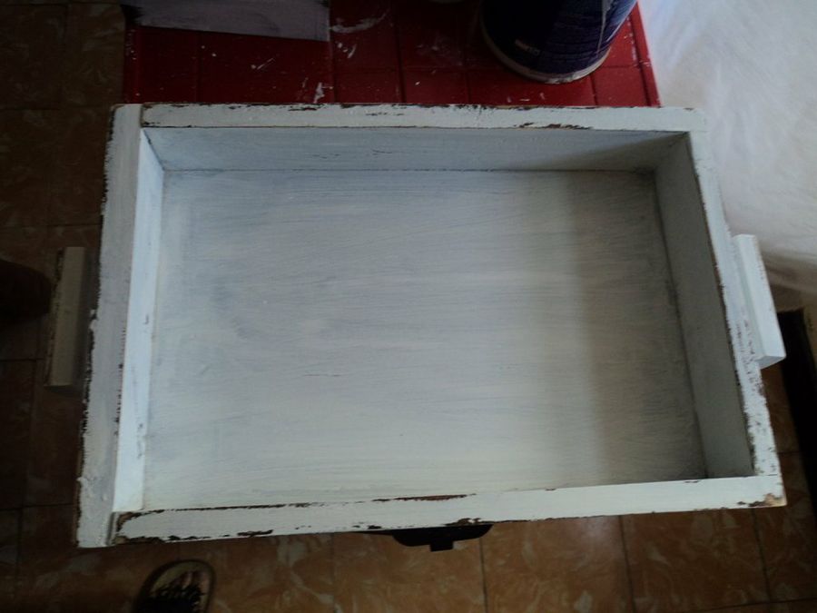 Luego de haberle pasado una vela por los bordes, nuestra amiga procedió a pintar el cajón de color blanco "Bendito blanco que todo lo dignifica", señala DLula con entusiasmo. Nuestra amiga añadió un listón en el lado libre, algo que los cajones no necesitan pero las bandejas sí.