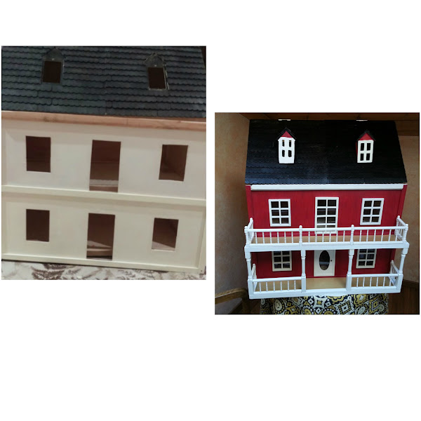 Las puertas de la fachada, puestas sin aun hacer los huecos de ventanas y puerta. Con una ingletadora de para madera corto los junquillos para construir los marcos de las ventanas. Algunos ingletes no me quedan bien, se ve en la foto que no quedan bien pegados, por lo que recurro al emplaste de serrín y cola. Como luego lo voy a pintar. Presentando una ventana, sobre el hueco de la fachada. Las ventanas pintadas de blanco, les pongo un junquillo y pongo un trozo de plástico rígido transparente a modo de cristal. La parte trasera de la casa, se pone el cableado, unido a un transformador de 12v, de un antiguo telefono. El tejado esta hecho con el papel ondulado de las galletas de chocolate cortado en trozos iguales simulando las tejas, después se pinta con pintura acrílica marrón y luego se le da cola de carpintero diluida en agua para endurecer las tejas. Para ocultar el cableado diseño una chimenea. Con dos junquillos y un trozo del dm. El zócalo lo voy haciendo con trozos del cartón de una huevera La fachada la pinto con pintura acrílica. El copete del tejado es un trozo reciclado de un mueble. Compro molduras de resina para decorar las ventanas, aquí en esta foto voy presentando como pueden quedar mejor.