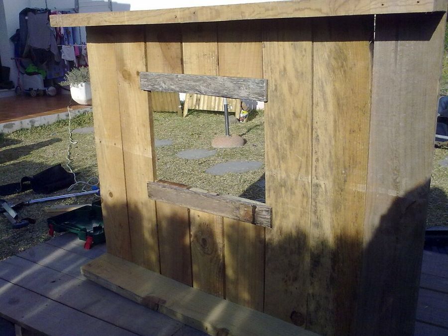Nuestro amigo monta el armazón de la casita con tablero DM, que luego irá revestido con la madera de los palets.