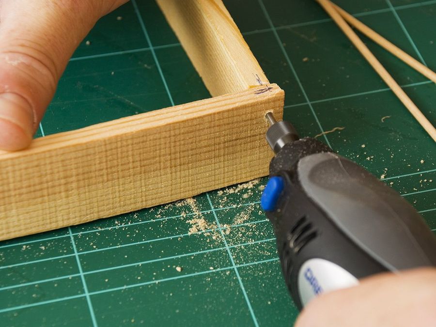 Para dar más solidez a las uniones, pondremos dos espigas en cada lado. Los palos de los pinchitos van muy bien a esa escala, y dado que son lisos les hacemos estrías con la sierra japonesa. Efectuamos los taladros cuidadosamente con la Dremel.