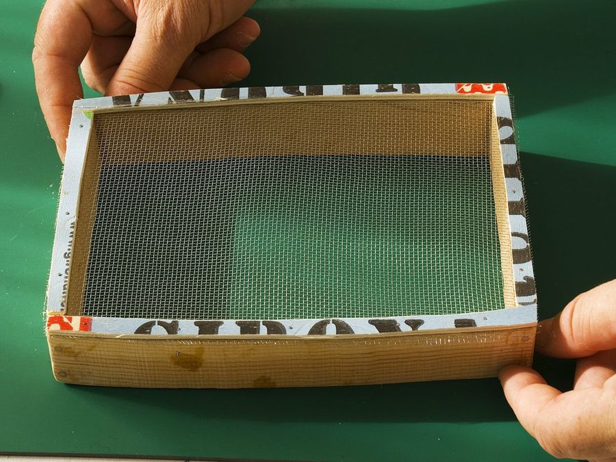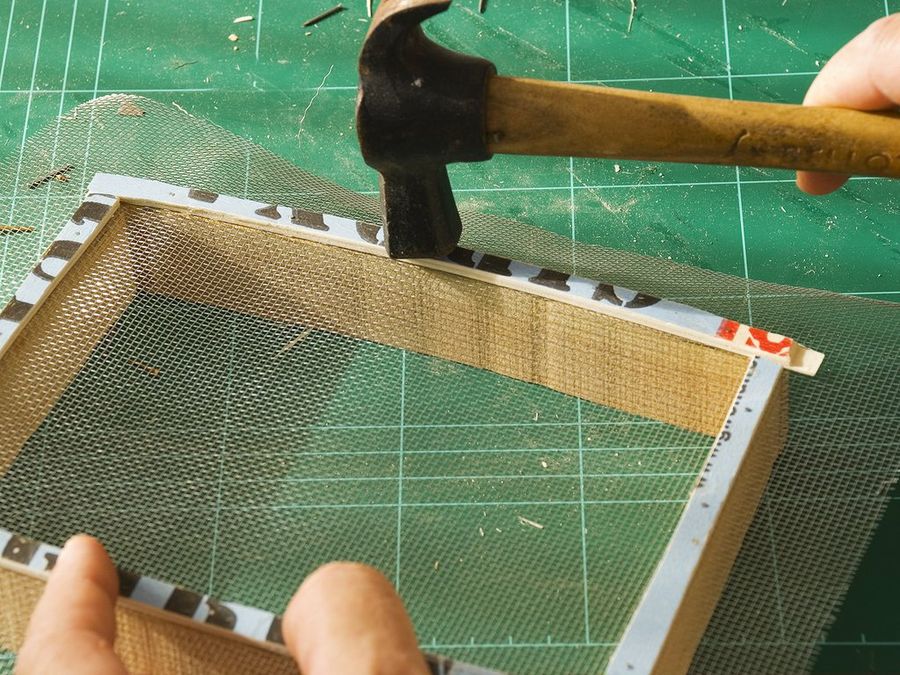 Pasadas 24 horas, la resina epoxi habrá secado. Llega ahora el turno de la fina malla metálica, que se recorta fácilmente con las tijeras. La sujetaremos con listoncillos clavados en la base, y como los lados son curvos debemos sacar las plantillas.