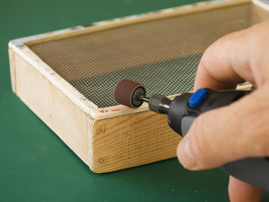 Llegamos ahora a la fase de acabado. Lijaremos cuidadosamente los ángulos, las cabezas de los tubillones, las zonas manchadas de resina epoxi y los 'flecos' de alambre. Empleamos nuevamente la mini herramienta Dremel, un aliado infatigable y con numerosas prestaciones, que poco a poco se está volviendo imprescindible en nuestro taller.