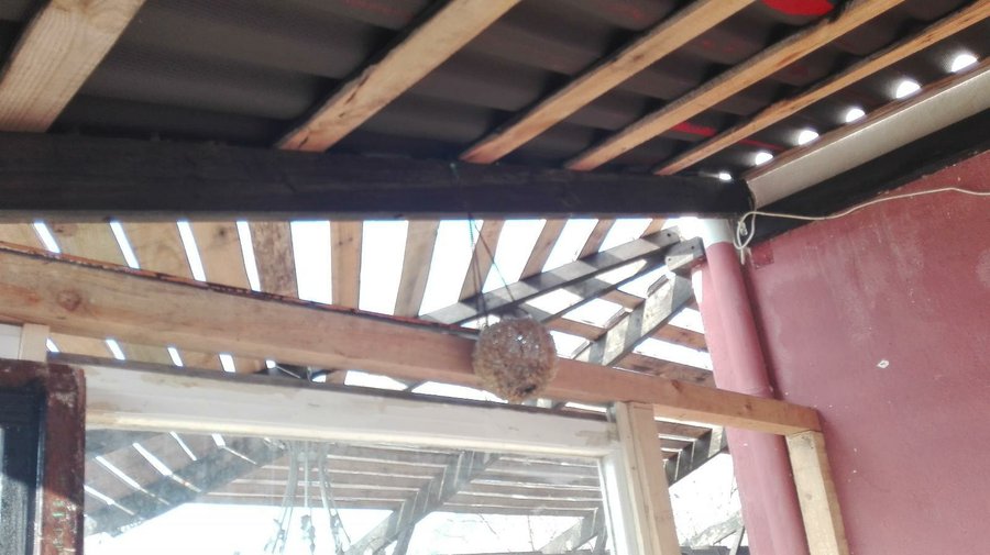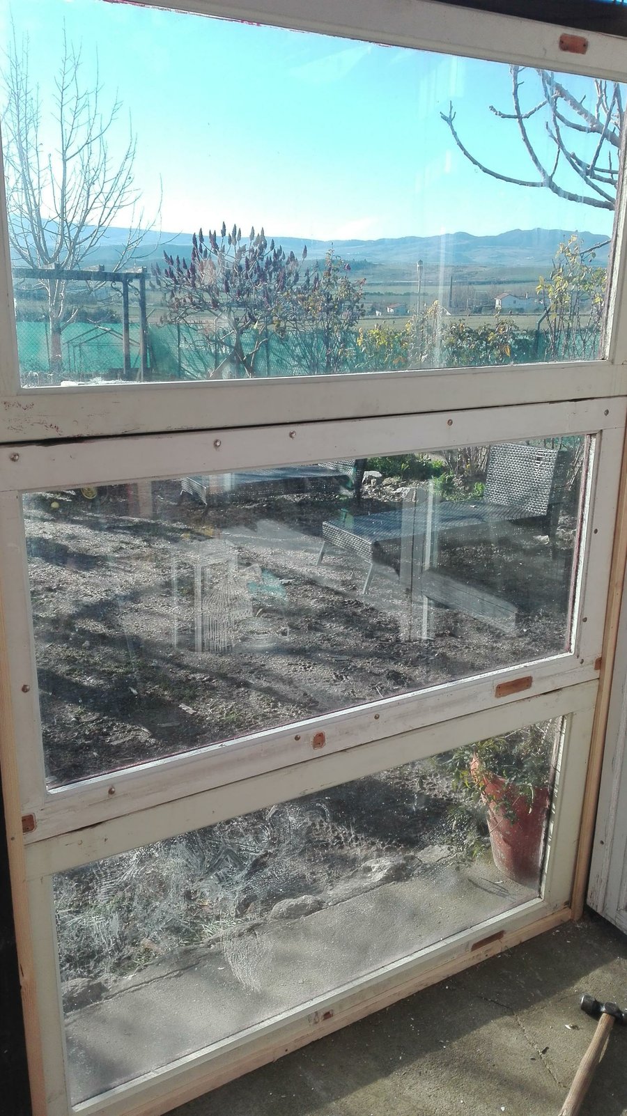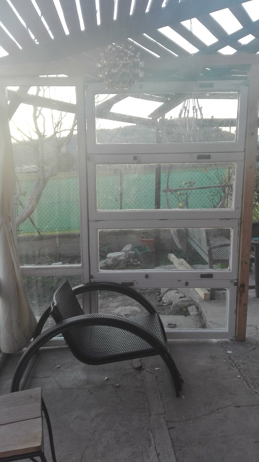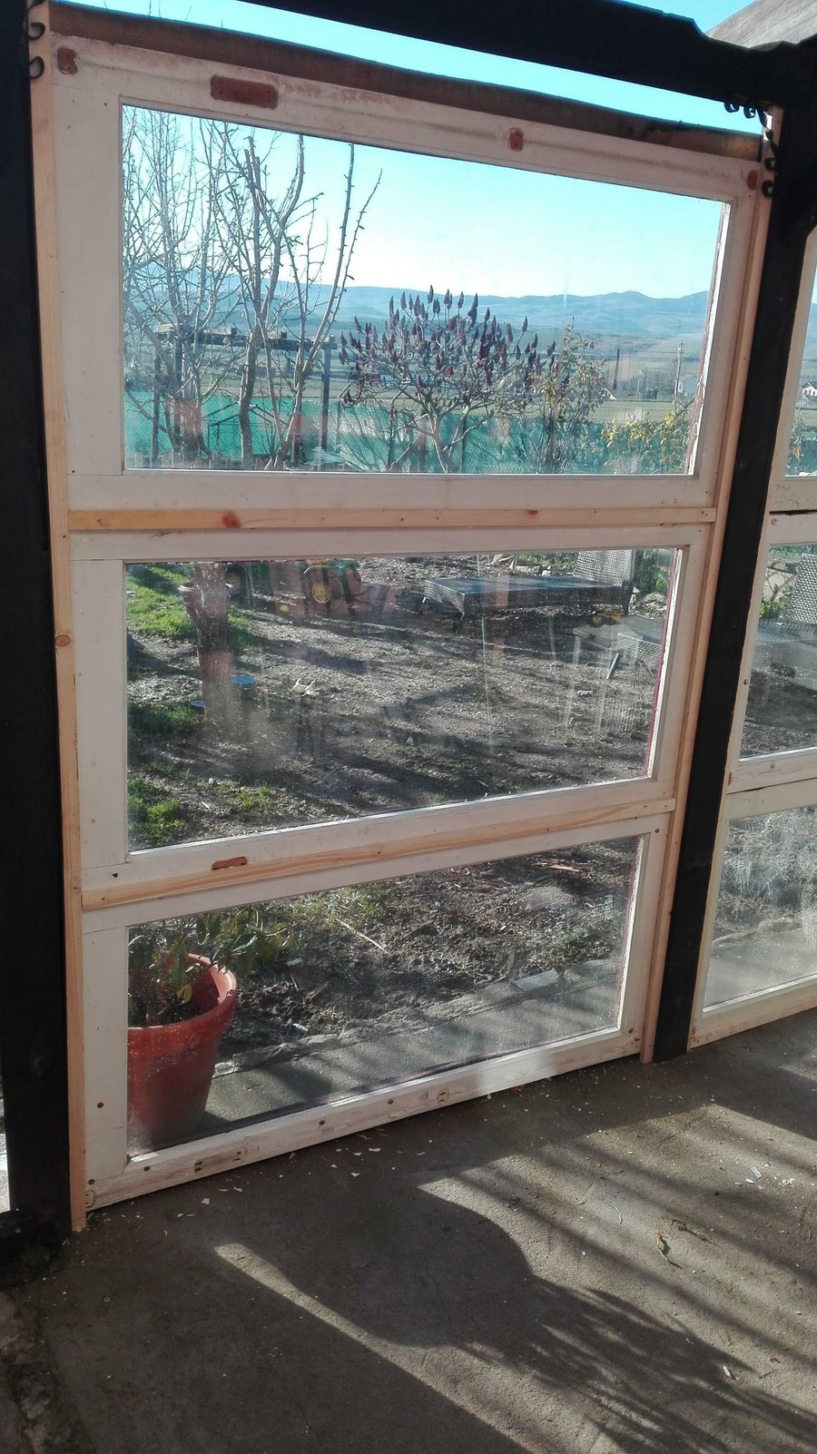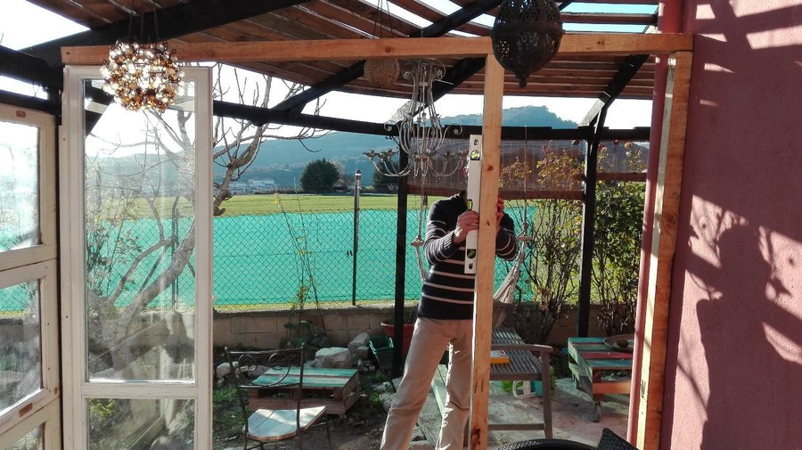 Este año ni cortos ni perezosos hemos decidido acristalada. Por supuesto a coste cero. Para ello hemos tenido que reunir mucho ingenio y encontrar una empresa qué se dedica a cambiar ventanas de madera por ventanas de aluminio. Preguntamos y nos dijeron que podíamos coger todo lo que quisiéramos, así que nos pusimos manos a la obra buscamos las ventanas que se ajustaron mas a los huecos que nosotros teníamos entre los pilares de la pérgola. Las fuimos colocando y apilando sujetándolas con tablas de palets por dentro y por fuera intentando dejar el menor espacio posible.