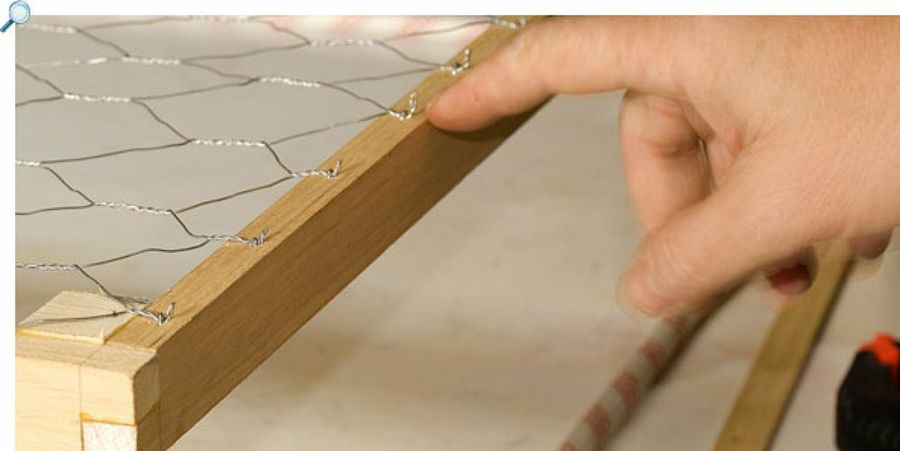Hicimos como ejercicio un bastidor muy liviano, dado que servirá para guardar sombreros. Con su malla de gallinero permite además ver desde abajo el contenido.