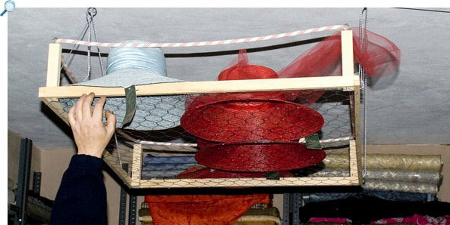 Aquí tenemos nuestro altillo. Como recordaremos, la baranda de cuerda impide que los sombreros se caigan por los lados, sin dañarlos. Aunque el peso total de “la raqueta” no llega a dos kilos, es un armazón muy sólido.Lo ponemos del revés para repasar las puntas que quedaron una vez cortados los alambres. En un taller de costura con telas de muy altos precios, hay que evitar los enganchones. Un descuido en los acabados podría ser catastrófico.