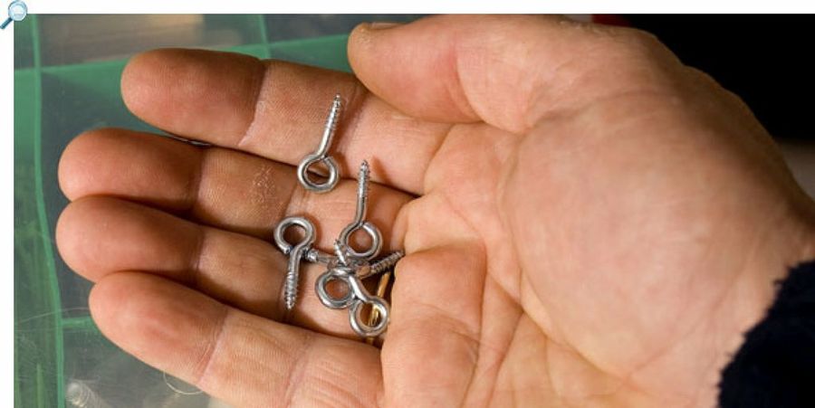 Para colgar el bastidor con la cuerda, pondremos en el marco esos cáncamos pequeños pero muy sólidos. Como precaución adicional, al enroscarlos dejaremos la abertura hacia abajo, de esa forma será imposible que la cuerda se suelte.