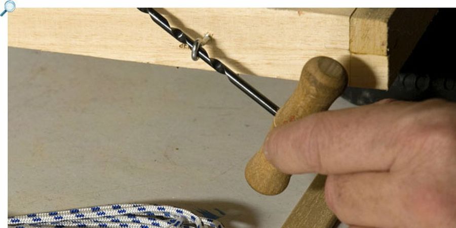 La misma barrena que empleamos para abrir los agujeros de los cáncamos en el listón, nos facilita la labor de completar las últimas vueltas.