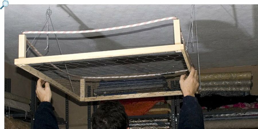 Ponemos un cáncamo en cada esquina, y llevamos las dos cuerdas de cada lado hasta una resistente anilla. Su función es hacer tope en las poleas, a la vez que impiden molestos balanceos en nuestro altillo.
