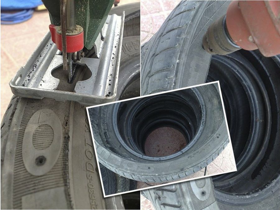 "Con la sierra de calar y hoja para metales cortamos por la mitad el anillo de goma en uno de los laterales. Antes hemos hecho unos taladros para unir los dos neumáticos con alambre".