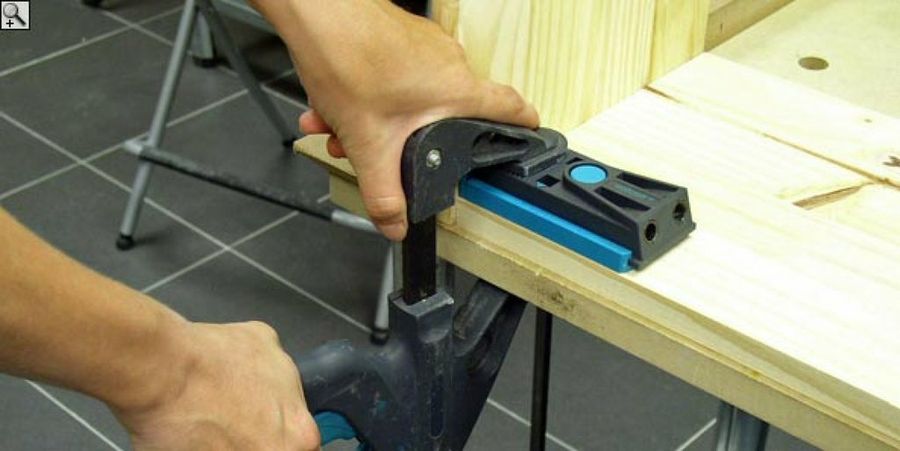 La colocamos sobre las piezas a ensamblar. Si es necesario, sujetamos con un gato.