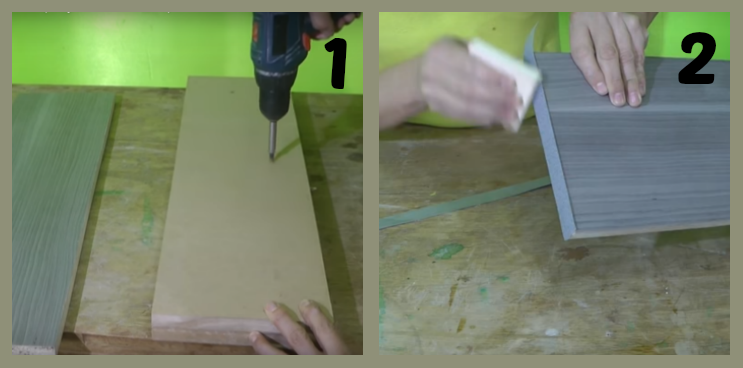2. En el caso de la melamina, se cubren los cantos o tapacantea y se pega con pegamento de contacto el tipo de papel que vamos a usar para esto, pero antes dejar secar 5 minutos. Después se pega con un taco y se cortan los sobrantes, e incluso lijamos para que se quede suave.