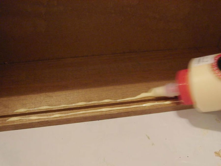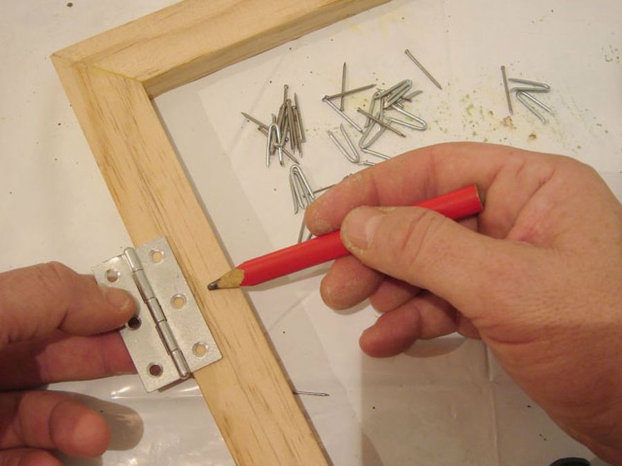 Para que la fina pared de la caja admita las bisagras que hemos escogido, debemos darle más cuerpo. Nada más fácil: encolamos y le pegamos un listón, más fino que los utilizados para el marco. Ahora ya tenemos un firme ?dintel? para atornillar las bisagras.