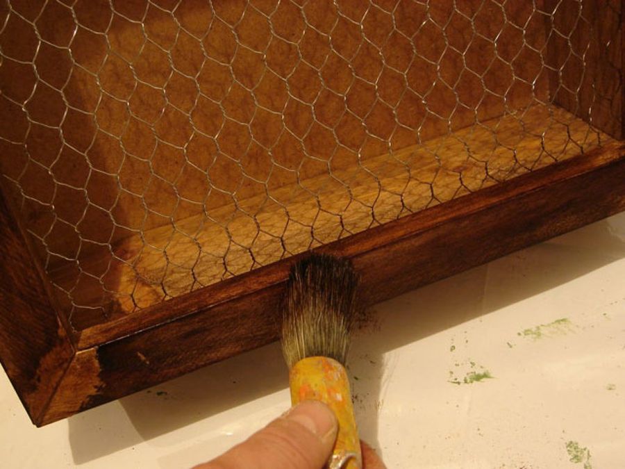 Teñimos el marco de la puerta con betún de Judea, y para igualar damos también una mano a toda la caja. Nuestra pequeña transformación ha sido un éxito. La caja ahora está ya casi terminada, en ese bonito color.
