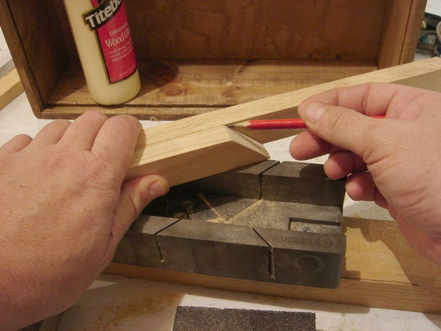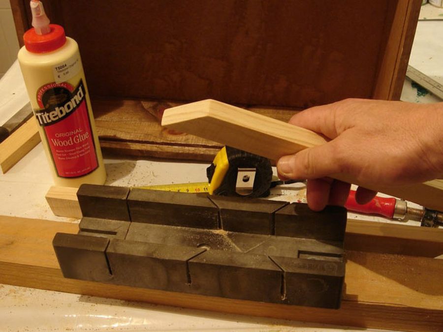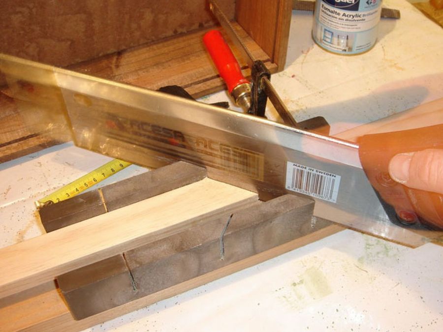 Hacemos los cortes a inglete con la guía y el serrucho de costilla. Como vemos, el listón es mucho más claro que la caja, de modo que al final lo teñiremos.