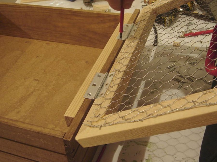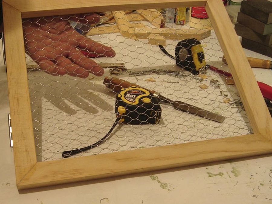 Fácilmente ?cosemos? la malla de gallinero por la parte interior, utilizando pequeñas grapas. Así hemos obtenido una puerta ligera pero muy firme.