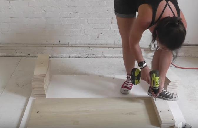 Después atornilla la tabla grande restante en ambos lados para que quede unida a los montones de tablitas. Cuando lo tengas listo dale la vuelta y quedarán todos los orificios de los tornillos en la parte de abajo.