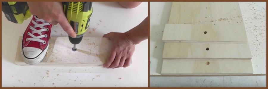 Una vez estén listas las cuatro tablitas con el agujero puedes atornillar el resto formando en total dos montones de 12 tablitas a cada lado. Ve intercalando la posición en la que pones los tornillos para que queden bien fijos.
